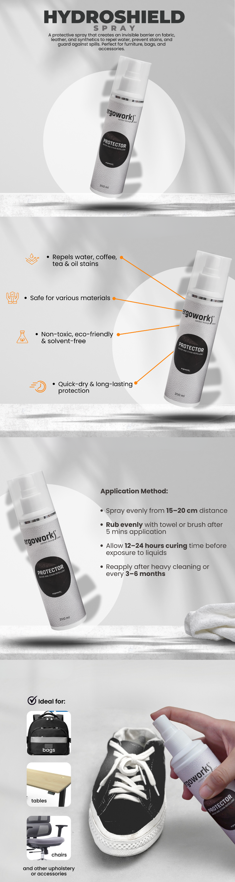 A high-performance spray that forms an invisible barrier on fabric, leather, and synthetic surfaces to repel water, prevent stains, and protect against spills. Ideal for chairs, tables, bags, and other upholstery or accessories.